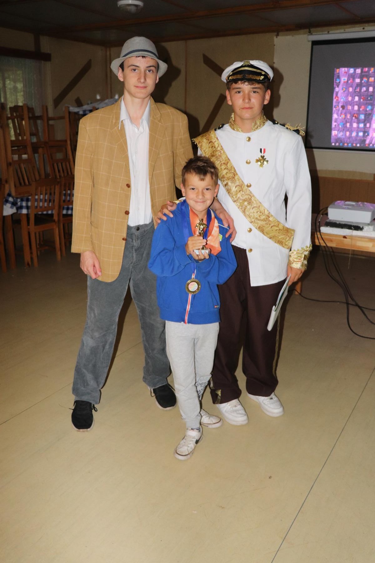 Dopoledne jsme vyplnili Táborovým talentem dětí. Odvážlivci předvedli, jaké vlohy se v nich skrývají, obecenstvo vytvořilo skvělou atmosféru a rozhodlo o konečném pořadí. Vítězem talentu se stal tanečník Daník Kranát, na druhém místě se umístila tanečnice Terezka Šimáčková a třetí místo obsadily Amélka Břízová, Johanka Fialová, Laura Novotná a Pipi Šebestová se svou gymnasticko – taneční sestavou. Talentová show volně přešla v dopolední diskotéku a hudba se táborem nesla i v průběhu oběda. A tak se zpívalo a tančilo, až pan kuchař ani neslyšel, kolik chtějí děti nandat knedlíků :)